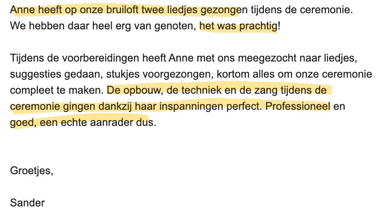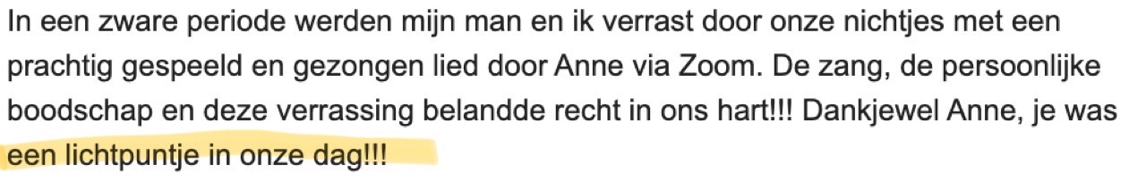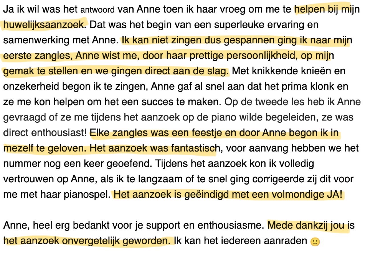 Ze heeft me naast dit alles ook veel meer zelfvertrouwen gegeven met het zingen en daar ben ik haar heel dankbaar voor. Ik kom uit Nijmegen en daarom is het voor mij nogal een lange reisafstand, maar ik heb tot nu toe geen betere vervanging kunnen vinden voor Anne. Na een les bij Anne voel ik bij mezelf elke keer weer verbetering, dus ik vind het ‘t zeker waard om voor een goede zangles naar Breda te rijden.