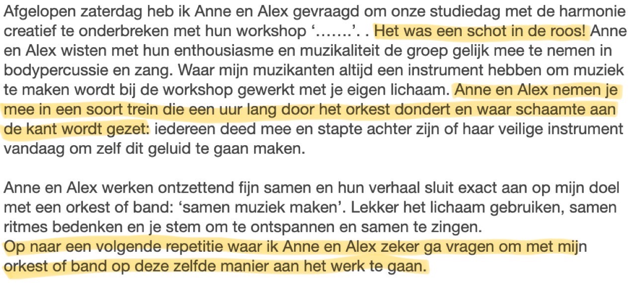 Ter ere van mijn 25-jarig onderwijsjubileum hebben Alex en Anne aan mijn team de workshop 'Heartbeat & Voice' gegeven. In een intieme setting brachten ze ons tot een ontspannen manier van zingen met grappige tropische teksten. Samen met het gebruik van allerlei soorten trommels, die Alex in een grote hoeveelheid bij zich had, werd het een leuke workshop die ons op ideeën bracht voor ons werk in de klas!