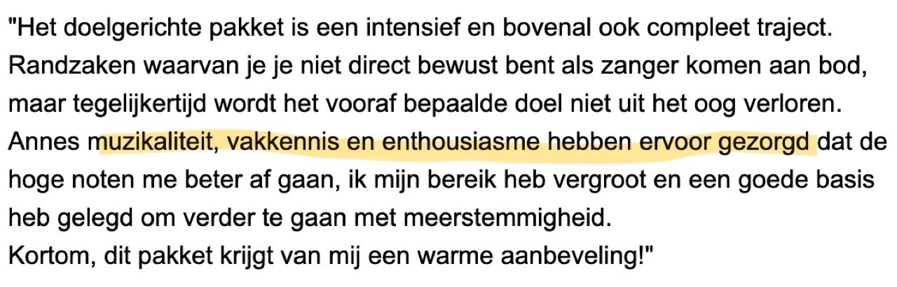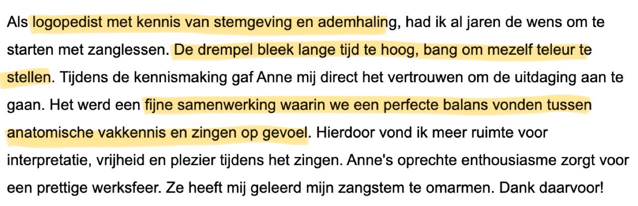 Mede dank zij Anne's altijd positieve, vrolijke, en super constructieve manier van lesgeven heeft ze mij doen inzien dat ik wel degelijk kan (leren te) zingen. En in een klein aantal privé lessen heeft ze me geholpen enorme stappen te maken.