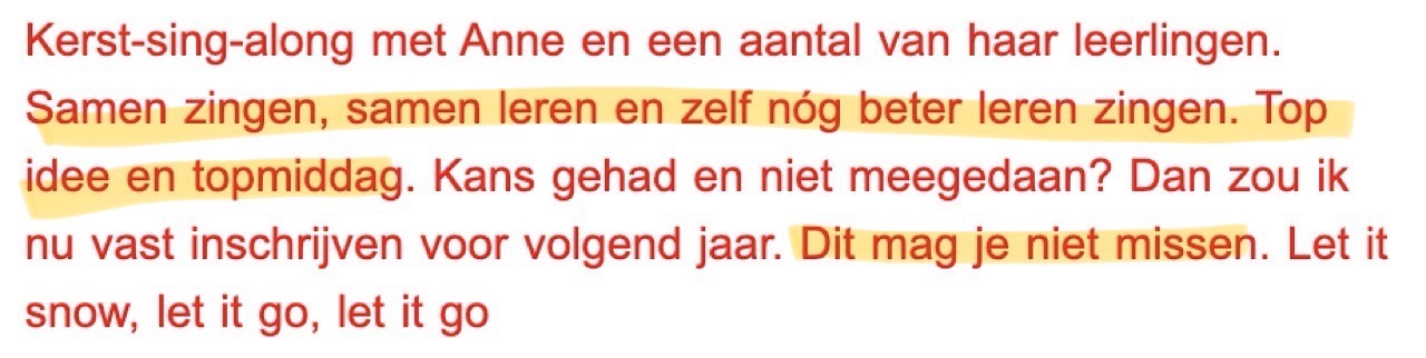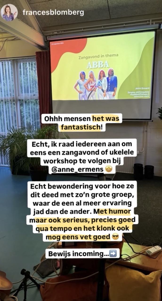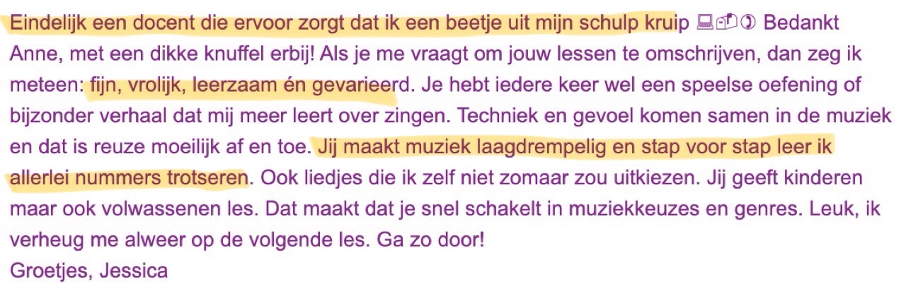 Dus als je dit leest en nog op zoek bent naar een gezellige, grappige, en lieve zangdocente, met een leuke en moderne manier van lesgeven, raad ik Anne zeker aan!