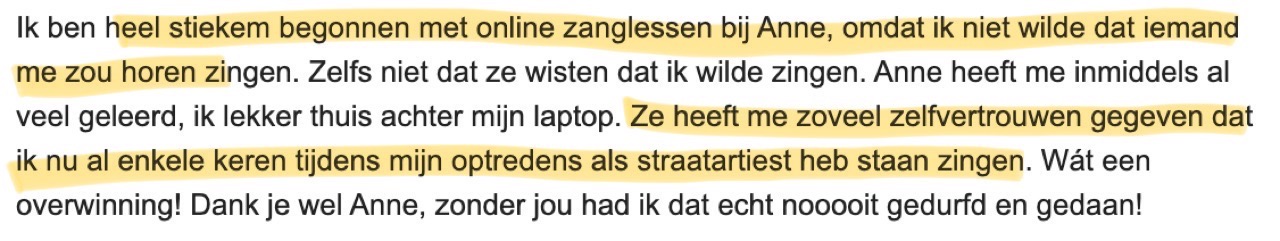 Ik vind zangles bij Anne altijd super leuk en leerzaam. Ik voel mij heel erg op mijn gemak bij haar en ze geeft je het gevoel dat fouten maken echt niet erg is, en dat zingen ook vooral heel leuk moet zijn! Ik wilde zangles om mijn techniek goed te ontwikkelen, dingen zoals je ademsteun (wat ik eerst nog helemaal niet had) en hoe je bijvoorbeeld je stem op verschillende manieren kunt inzetten.