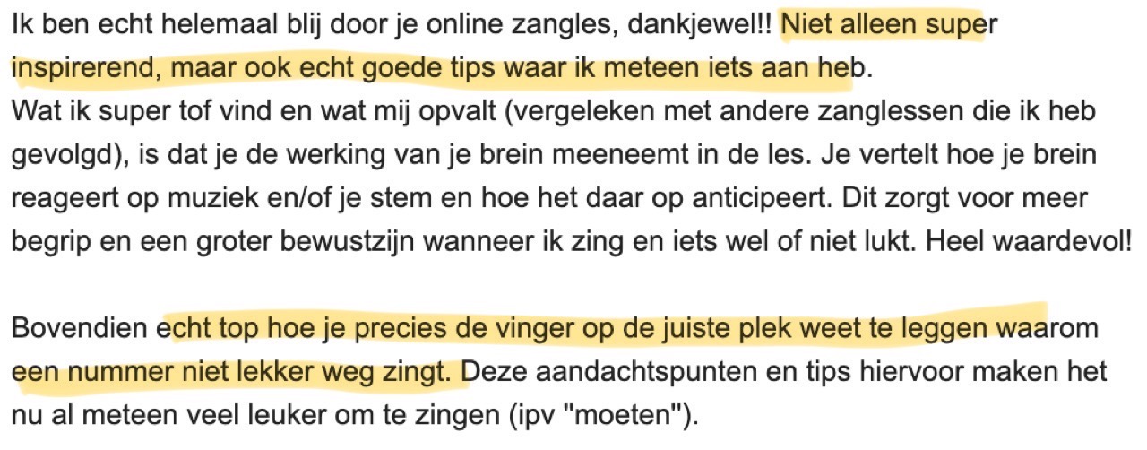 Ik word erg blij van van de zangles, het is voor mij een belangrijk moment in de week geworden om op te laden en ik leer veel.