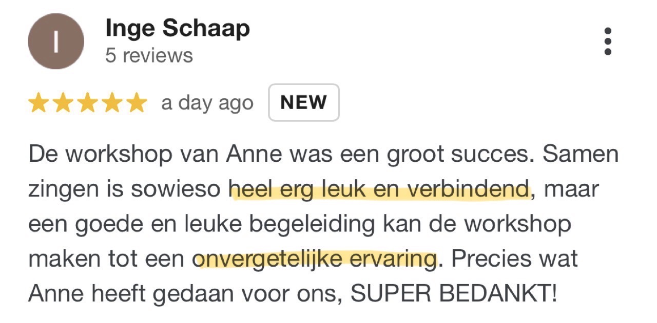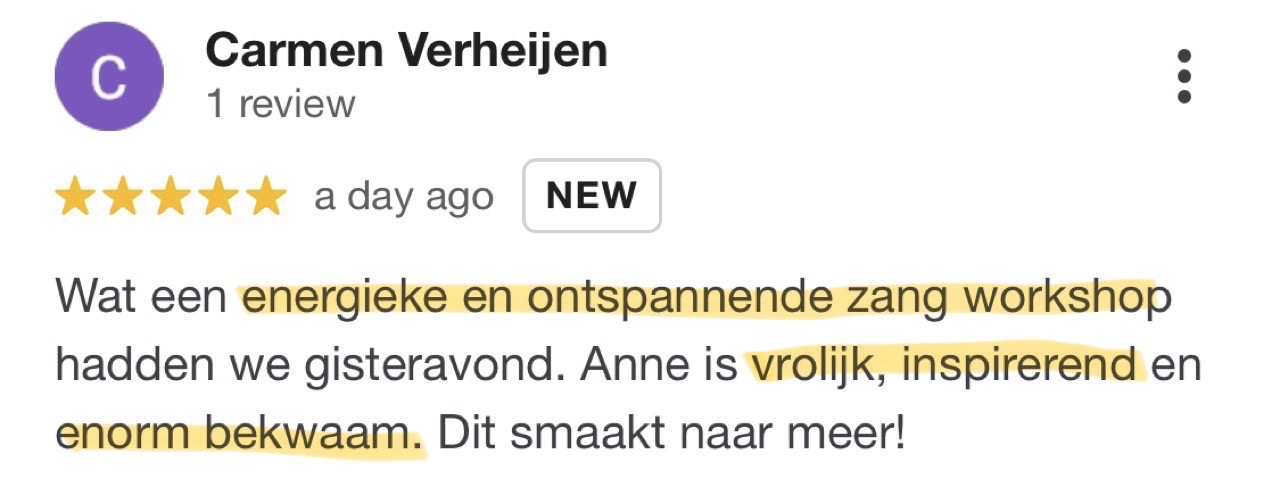 Echt bijzonder eigenlijk hoeveel een zangles van 45 minuten al voor je zelfvertrouwen kan doen. Door de fijne oefeningen, energie en feedback van Anne durfde ik mijn stem meer te gebruiken en perfectionisme los te laten. Op een gegeven moment voelde ik me zelfs super ontspannen door het zingen. Echt een aanrader voor iedereen die nieuwe dingen wil leren!