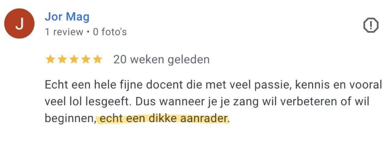 Geweldige lessen en steun, je voelt je echt vertrouwd, de beste zangcoach die ik tot nu toe heb gehad!! ze heeft vertrouwen in je, en dat voelt goed.